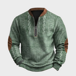 Тази мъжка плетена блуза с ½ цип съчетава класически релефни мотиви и модерни детайли за безупречна визия през студените дни. Меката вътрешна подплата и еластичните маншети осигуряват комфорт и задържане на топлината, а подсилените лакти с велурен ефект добавят характер и издръжливост. Универсалната кройка стои отлично върху тениска или риза, а ципът позволява лесно регулиране на температурата – от офис до уикенд разходка. Идеален избор за подарък и за ежедневна употреба.